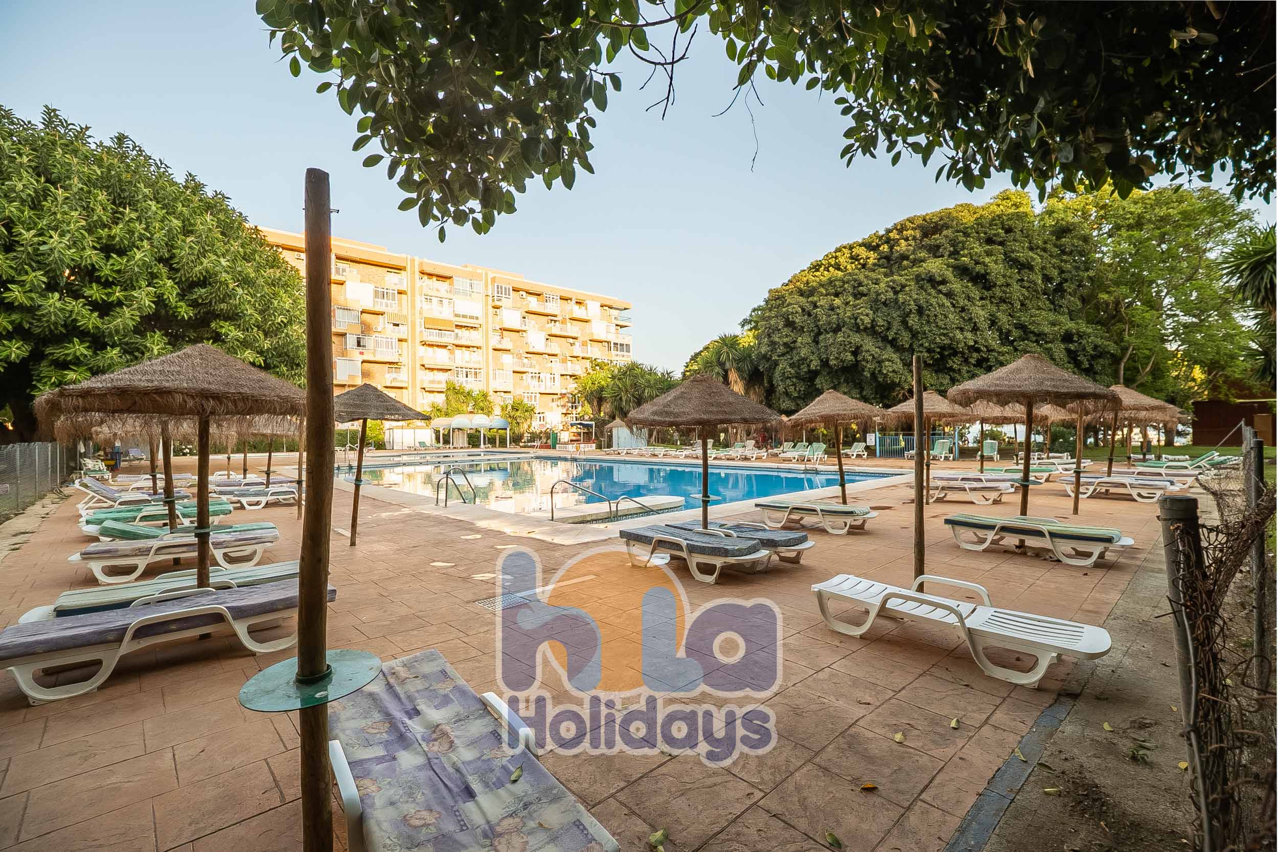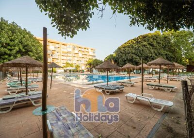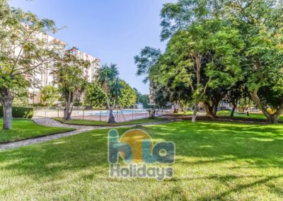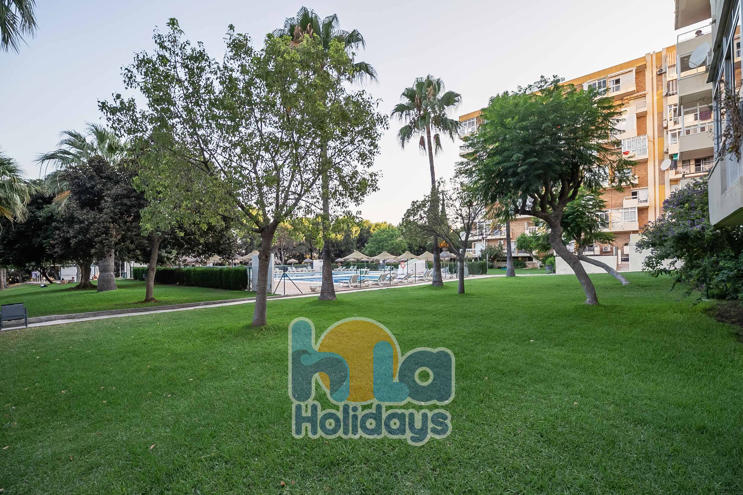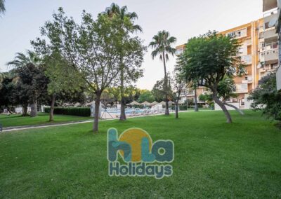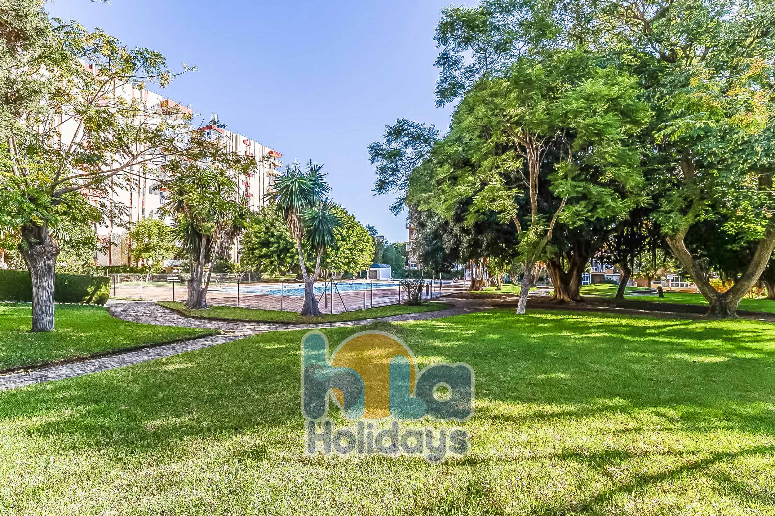 Acceso a zona de piscinas con varias zonas de piscinas de gran tamaño y para adultos y niños y amplias zonas verdes ajardinadas con muchos árboles y zonas de sombra. La zona de jardín cuenta según la época del año con un bar. El edificio dispone de amplia zona de recepción con personal disponible 24 horas y amplia zona de descanso.