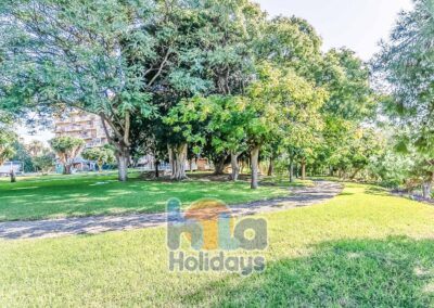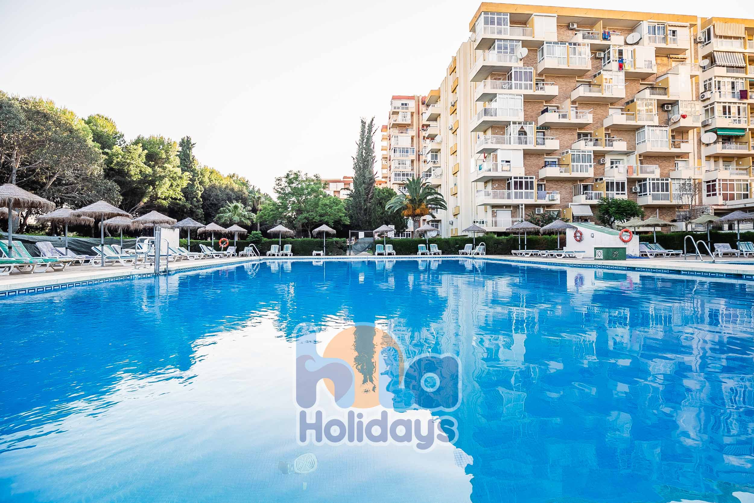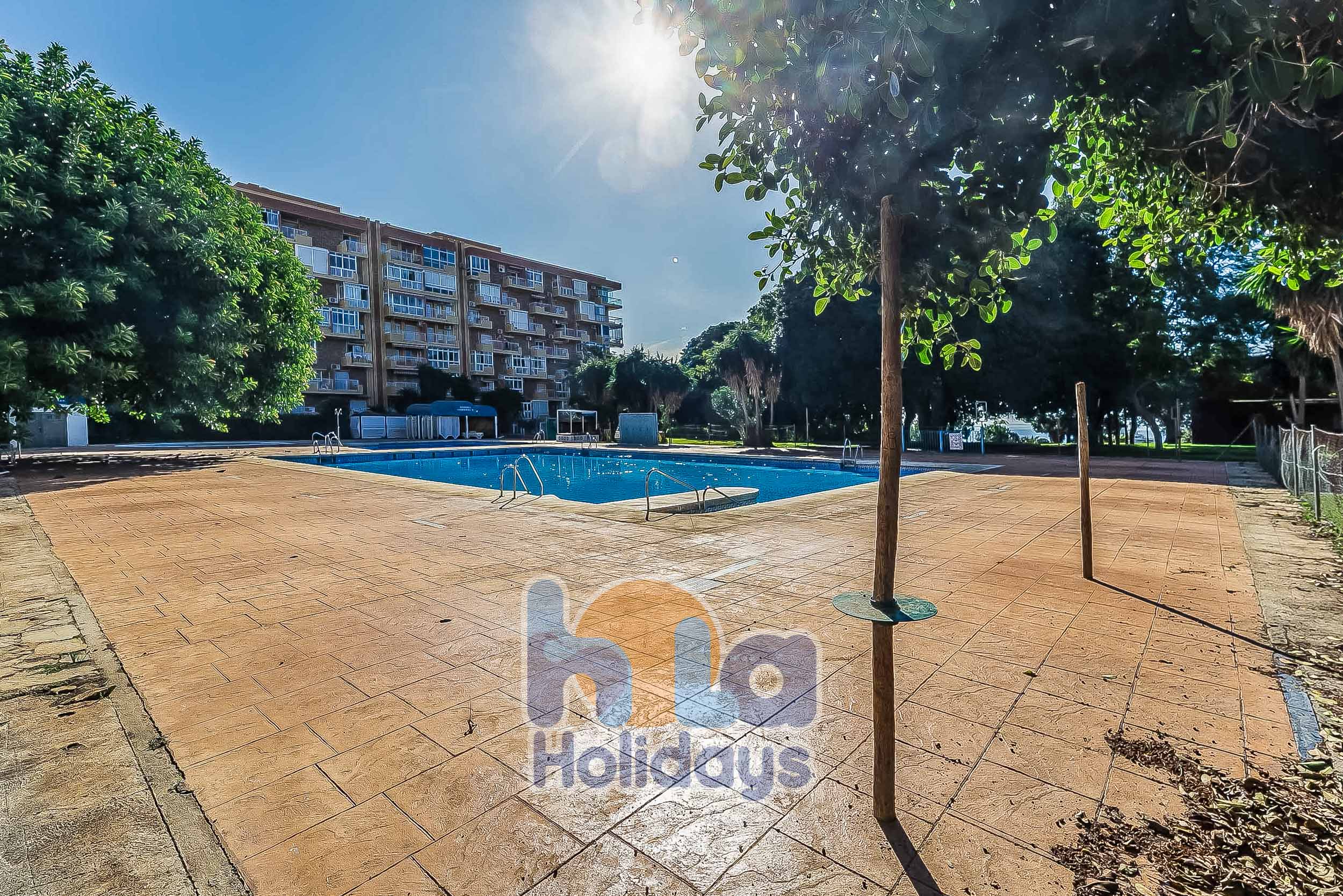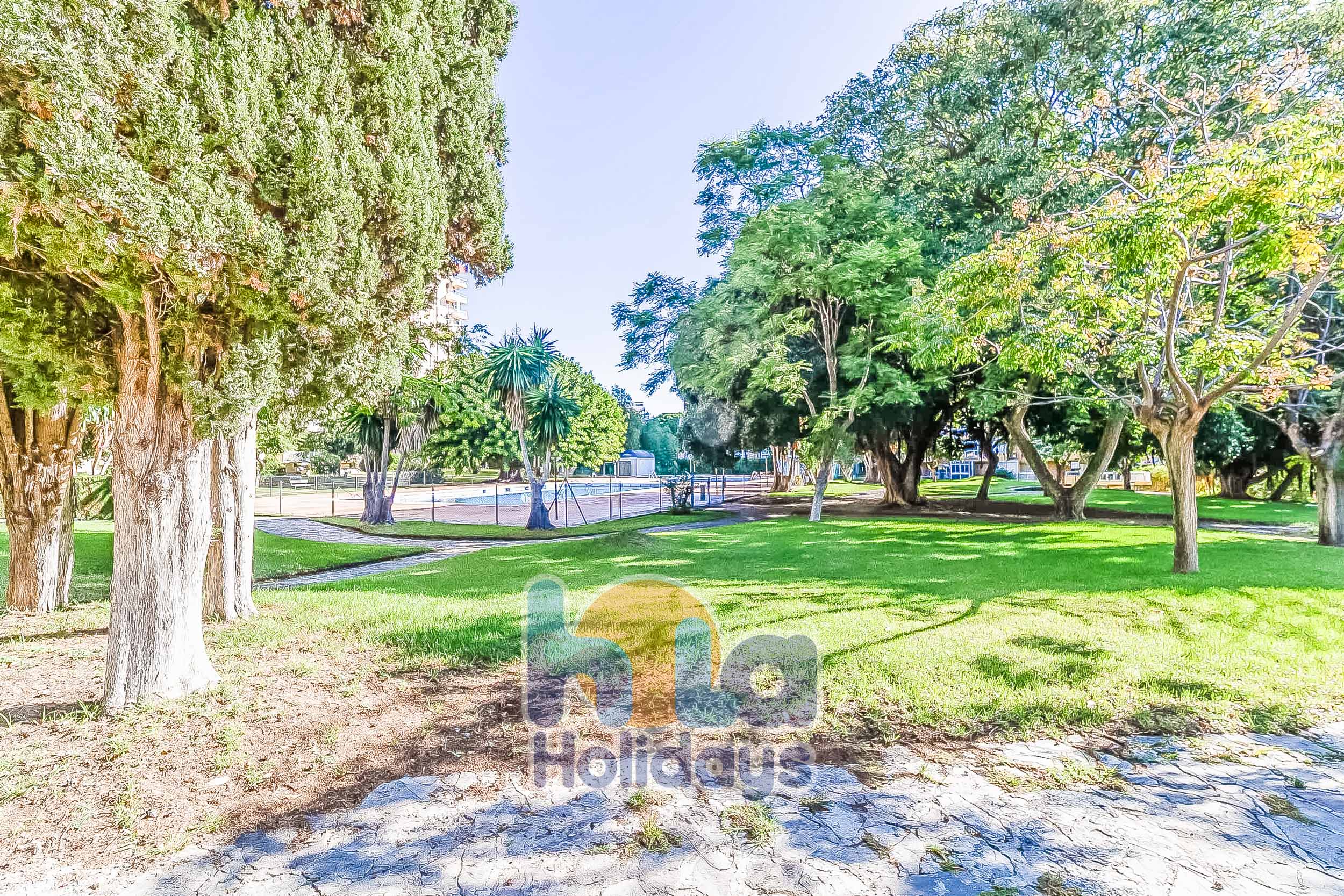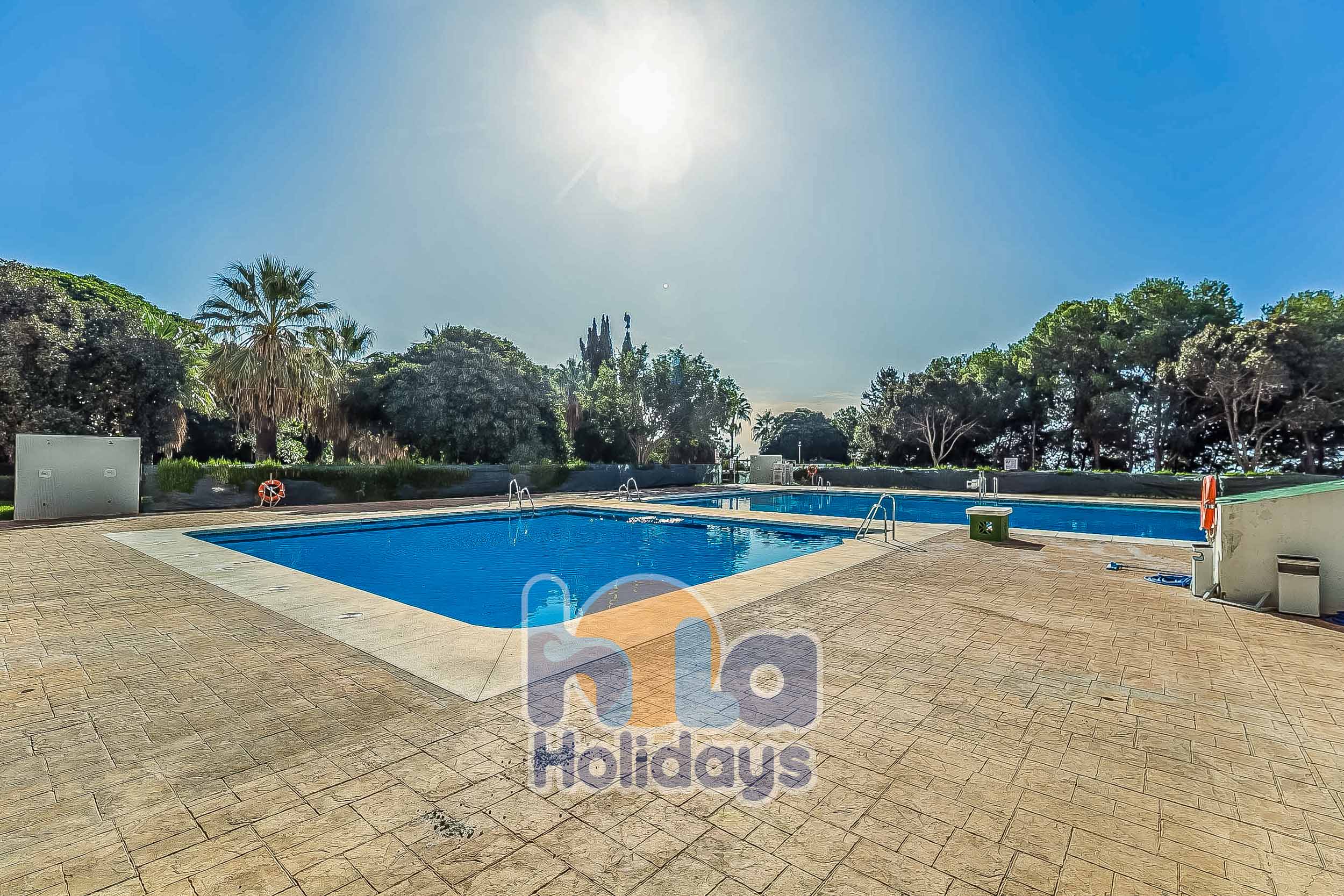 Acceso a zona de piscinas con varias zonas de piscinas de gran tamaño y para adultos y niños y amplias zonas verdes ajardinadas con muchos árboles y zonas de sombra. La zona de jardín cuenta según la época del año con un bar. El edificio dispone de amplia zona de recepción con personal disponible 24 horas y amplia zona de descanso.