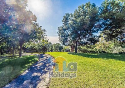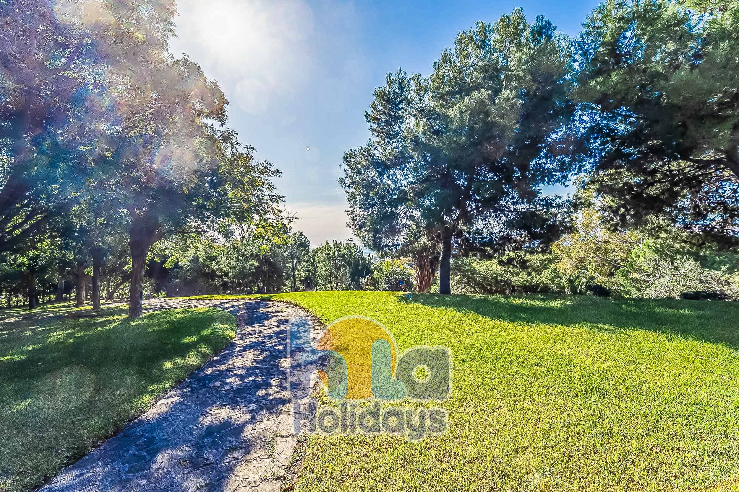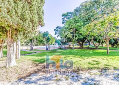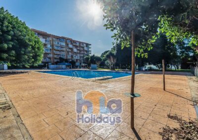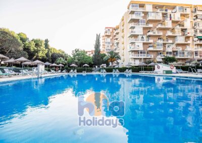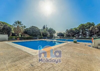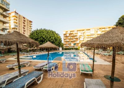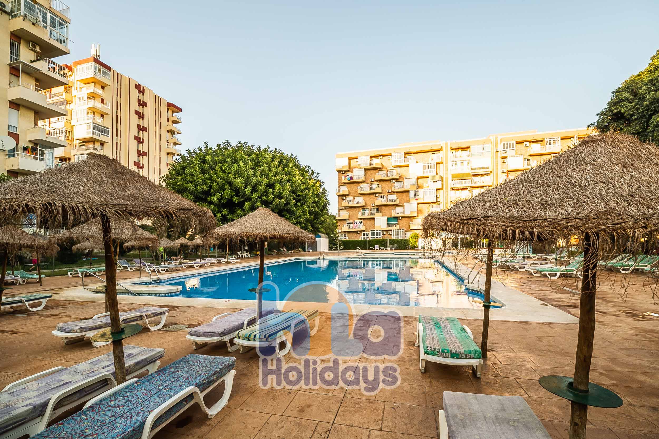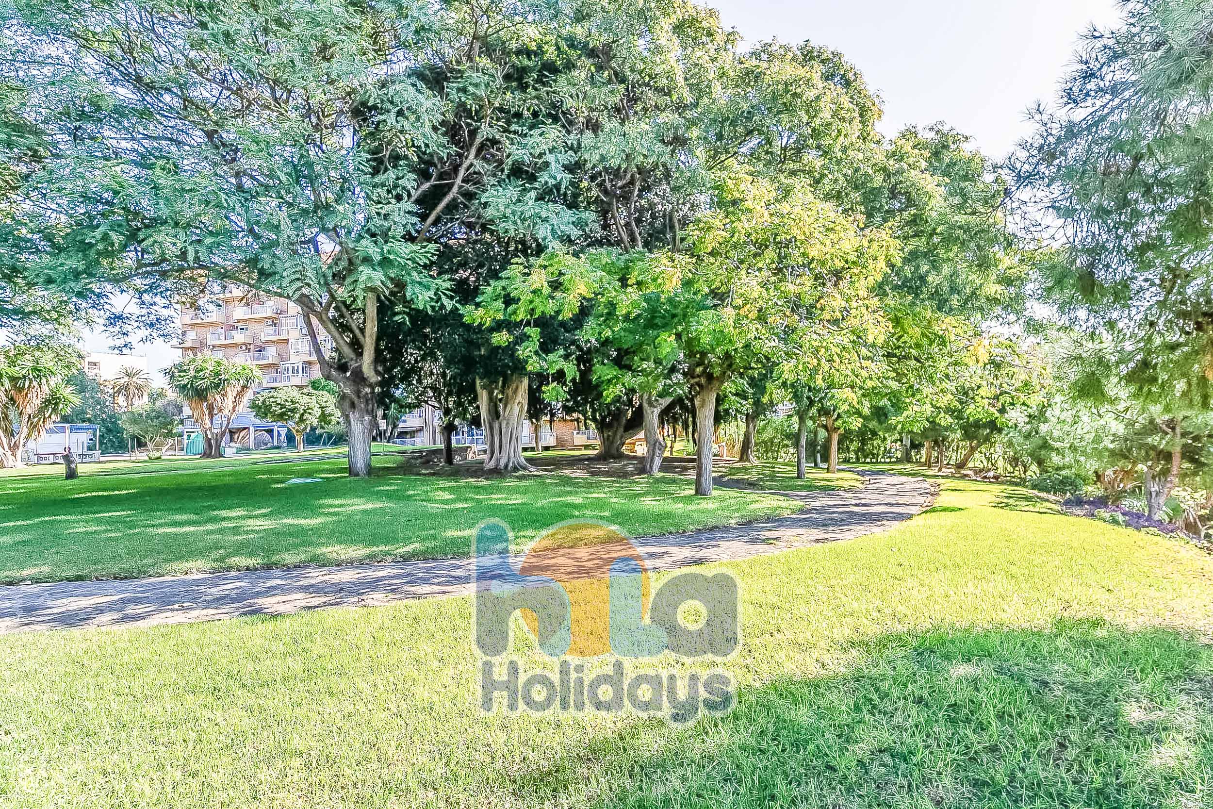 Acceso a zona de piscinas con varias zonas de piscinas de gran tamaño y para adultos y niños y amplias zonas verdes ajardinadas con muchos árboles y zonas de sombra. La zona de jardín cuenta según la época del año con un bar. El edificio dispone de amplia zona de recepción con personal disponible 24 horas y amplia zona de descanso.