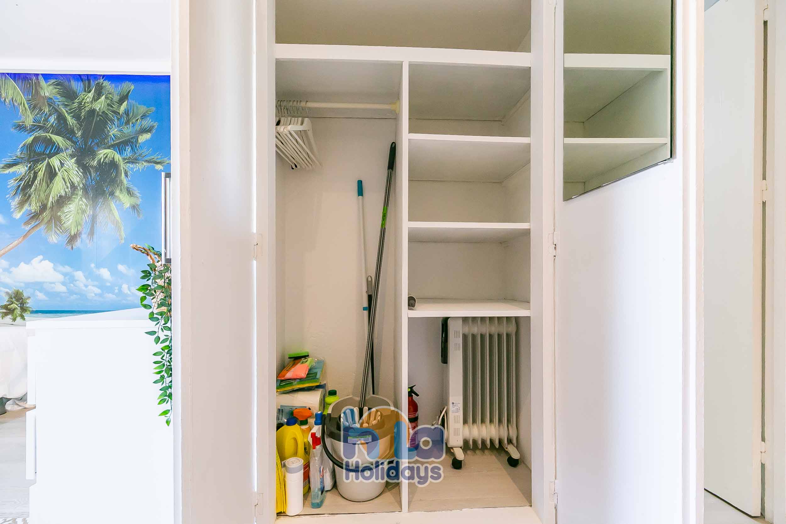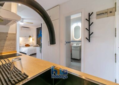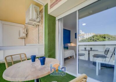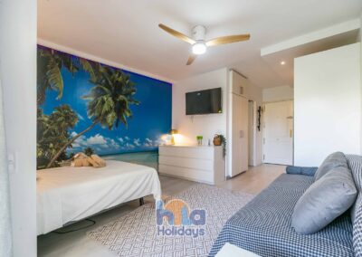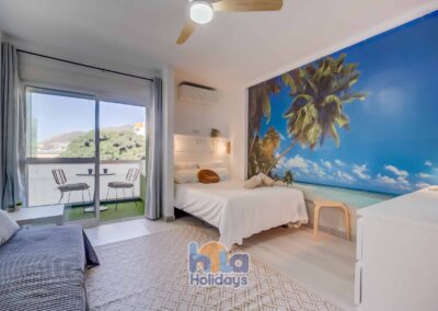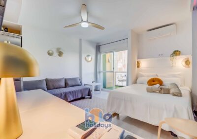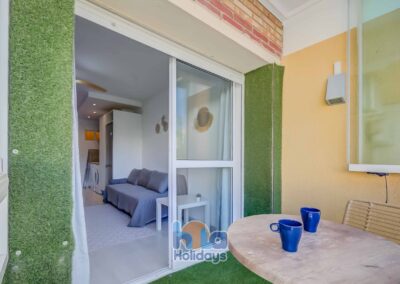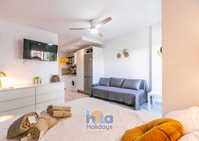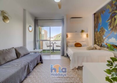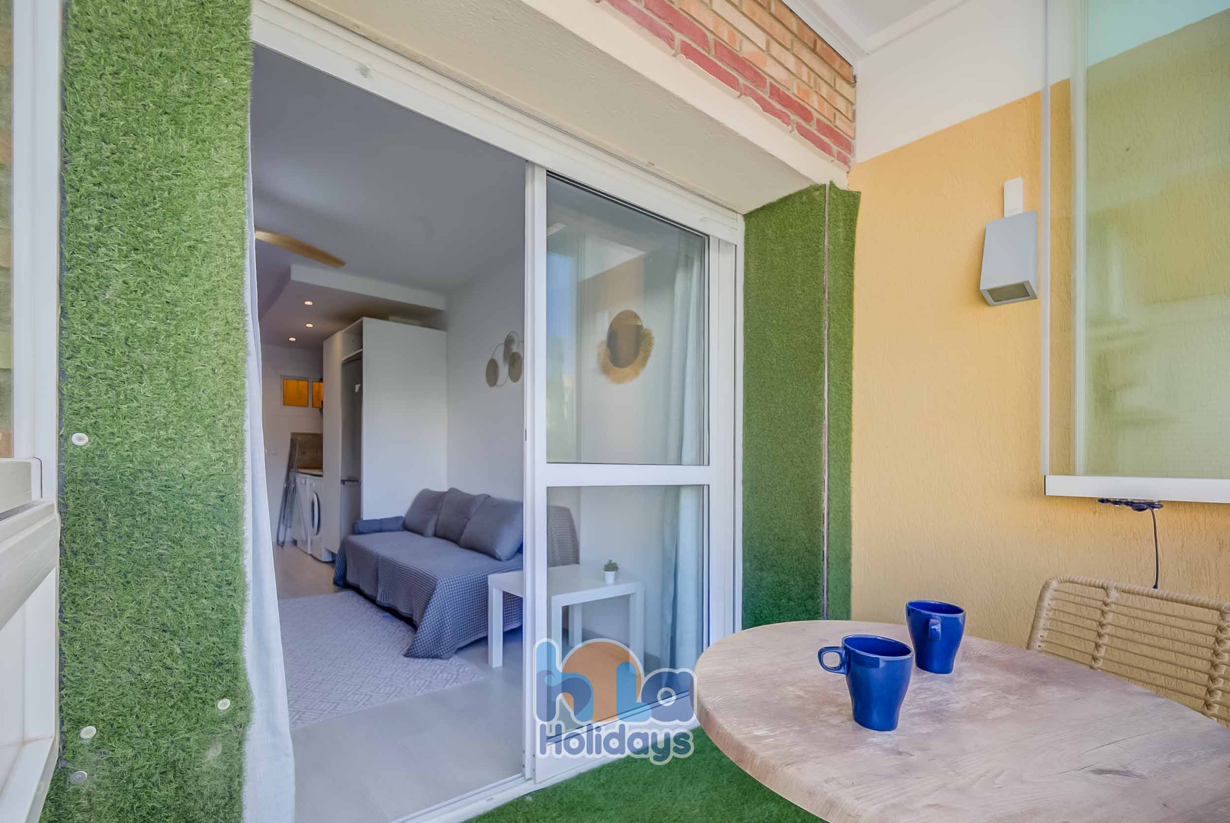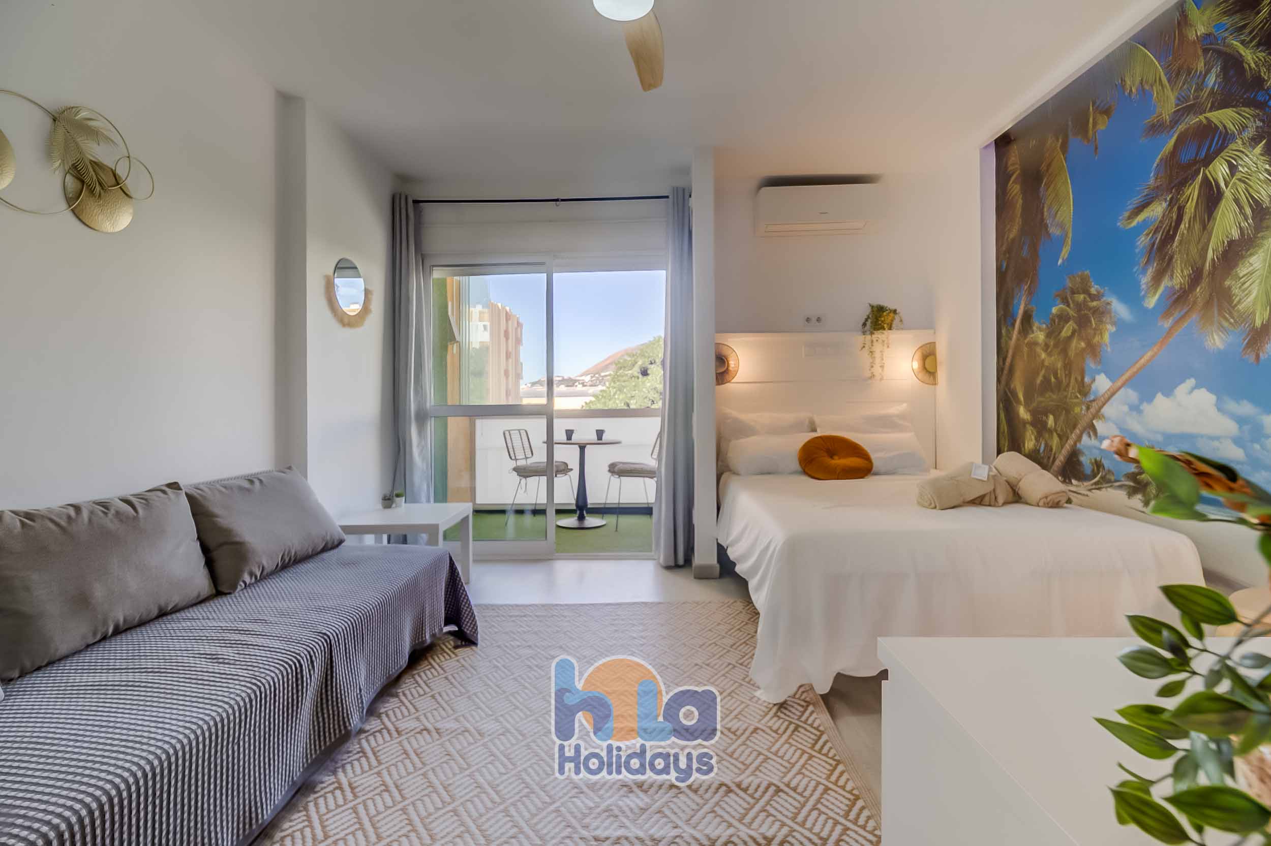 En el salón se encuentra un cómodo sofá cama para 2 plazas, un mueble de cajones, TV y la cama de matrimonio. La terraza acristalada y aislada con cristales de lumón, ubica mesa y sillas como zona de comedor junto a la gran ventana. Está la zona de TV y hay conexión a internet por fibra. El salón además dispone de split de aire condicionado. También un amplio armario empotrado y diversas zonas de almacenaje.