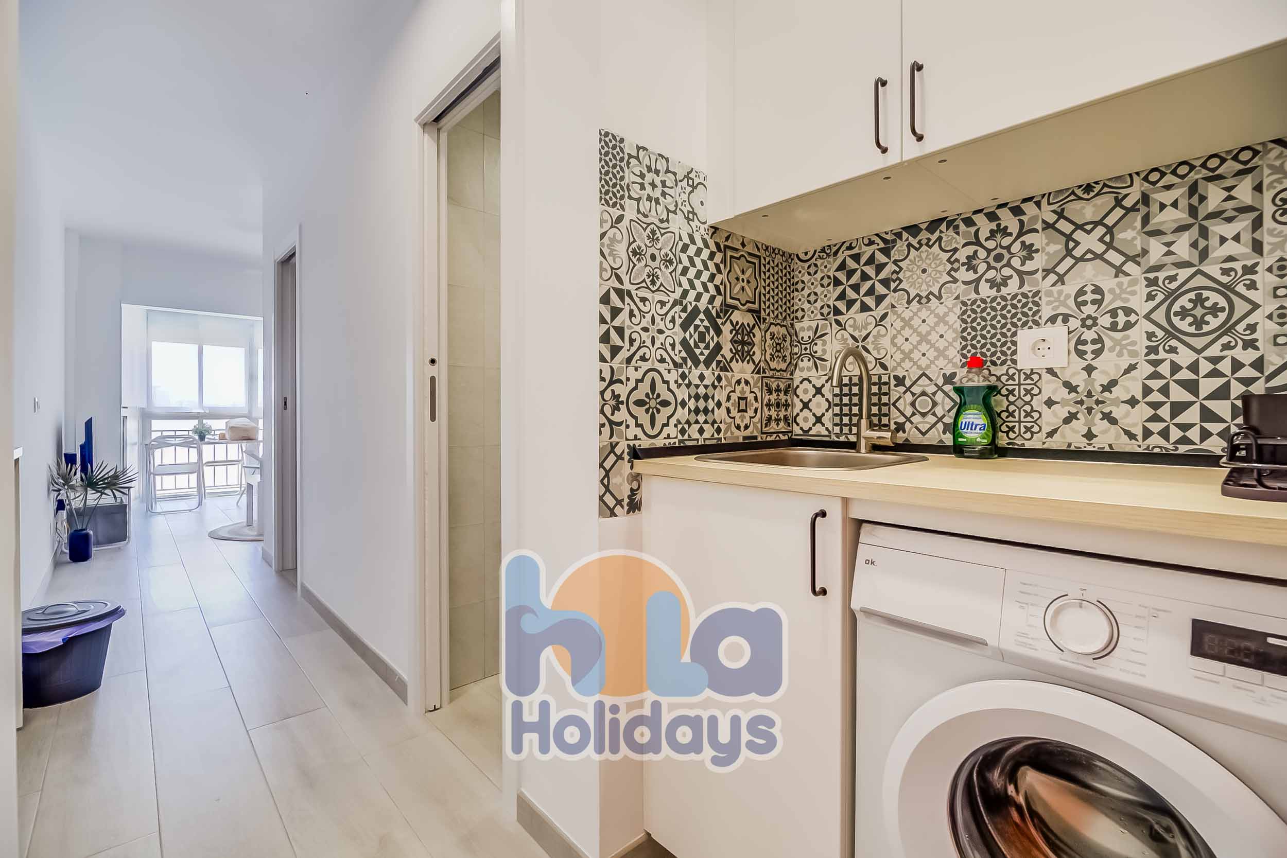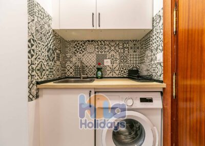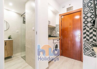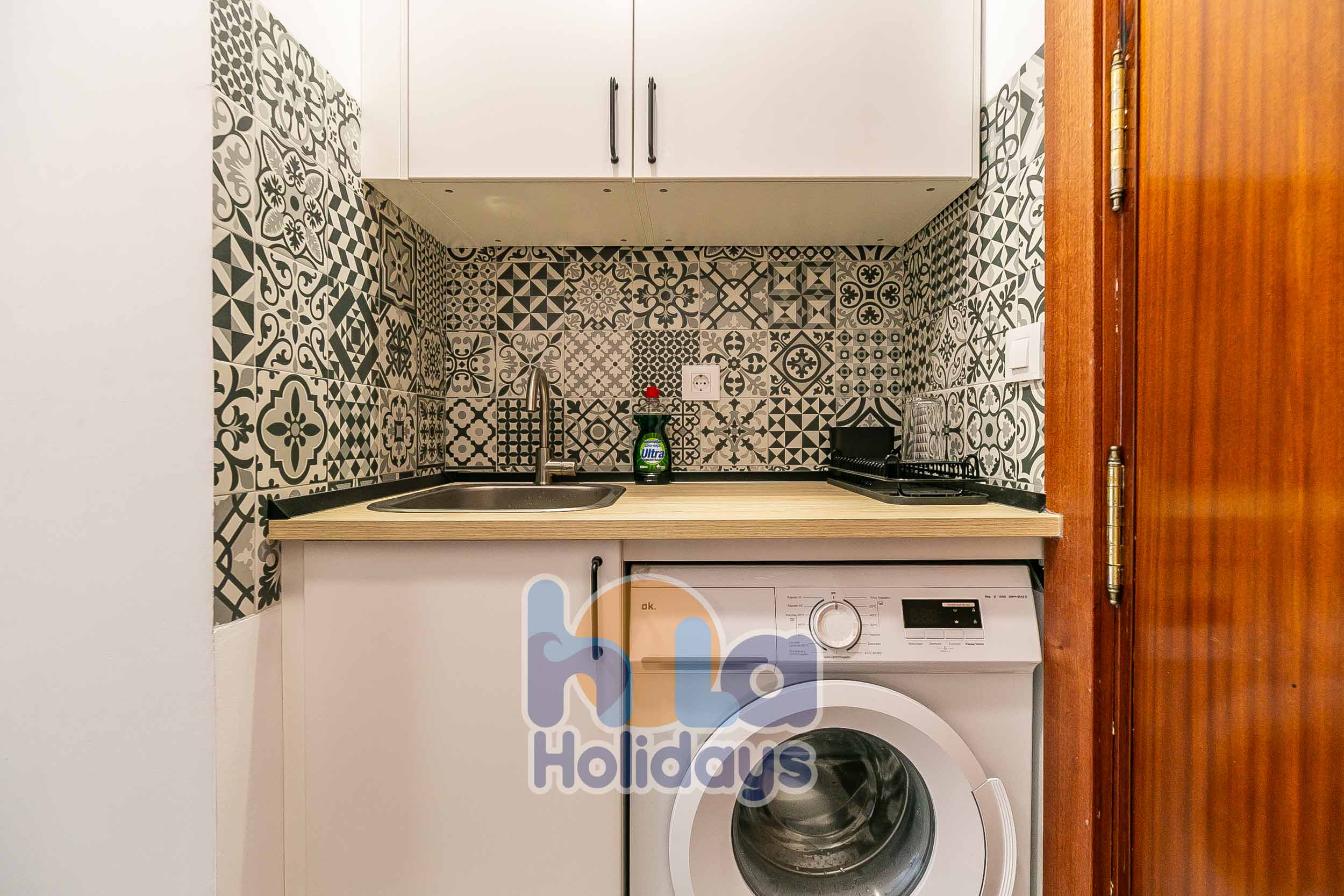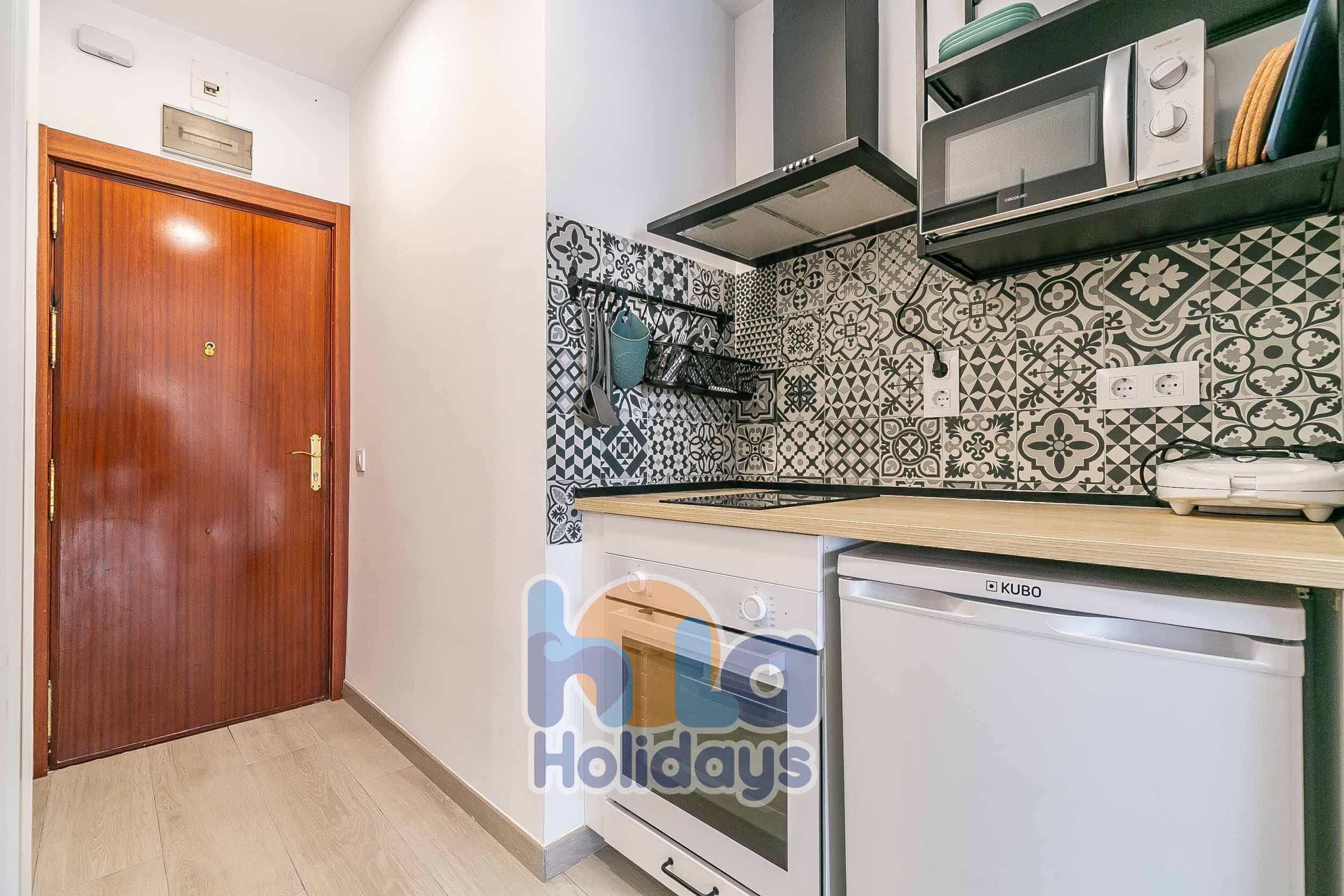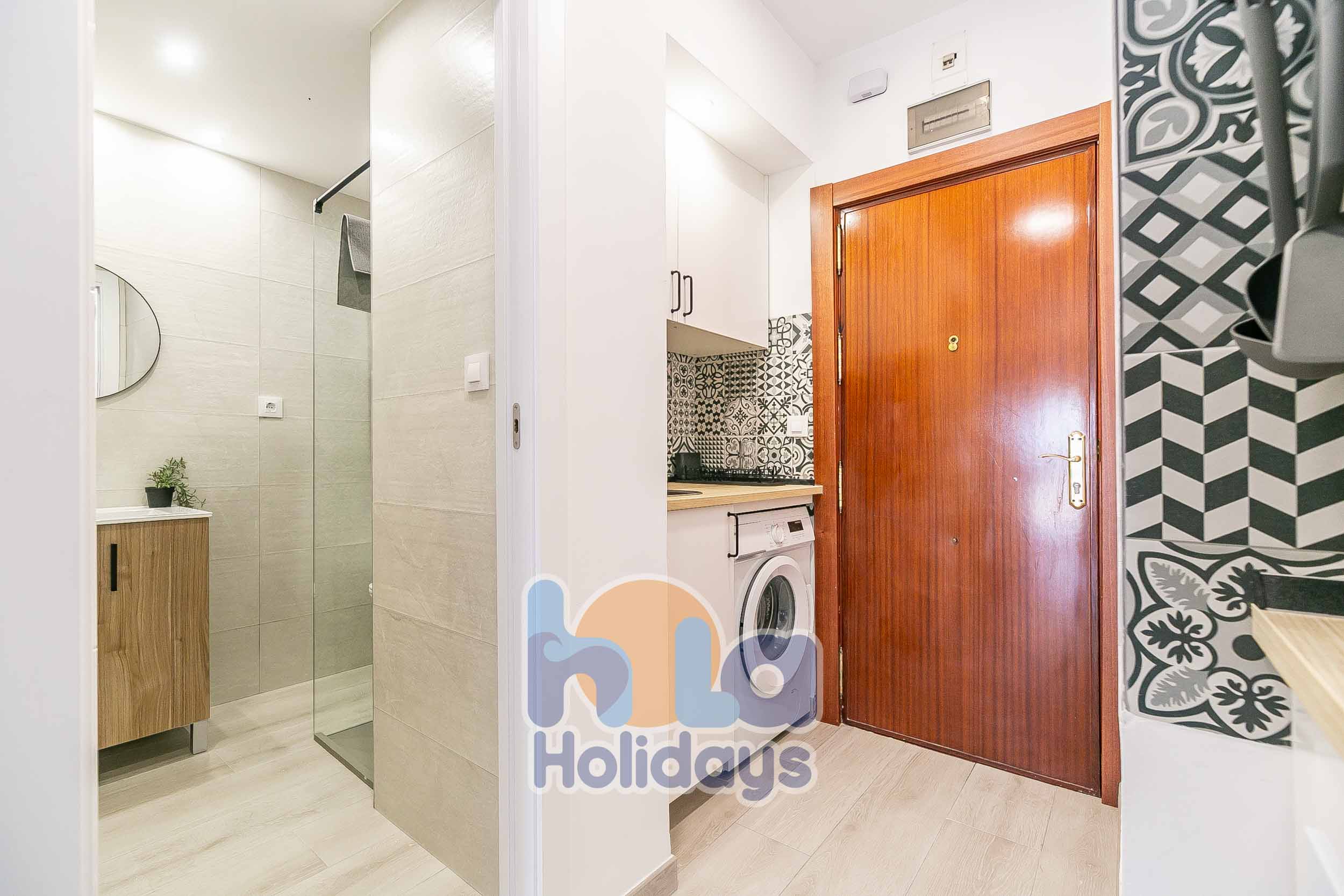 El apartamento se compone de una entrada con la zona de cocina al principio, donde bajo la encimera está la lavadora y fregadero. Le sigue la zona de cocina de electrodomésticos, donde está el horno, vitrocerámica, extractor y frigorífico.