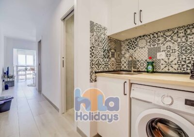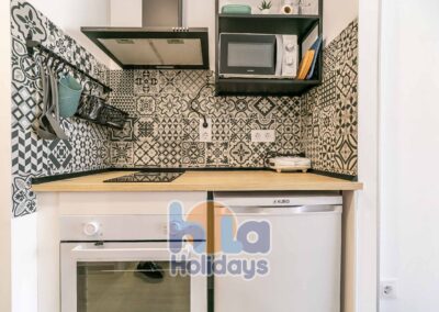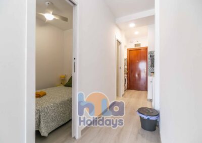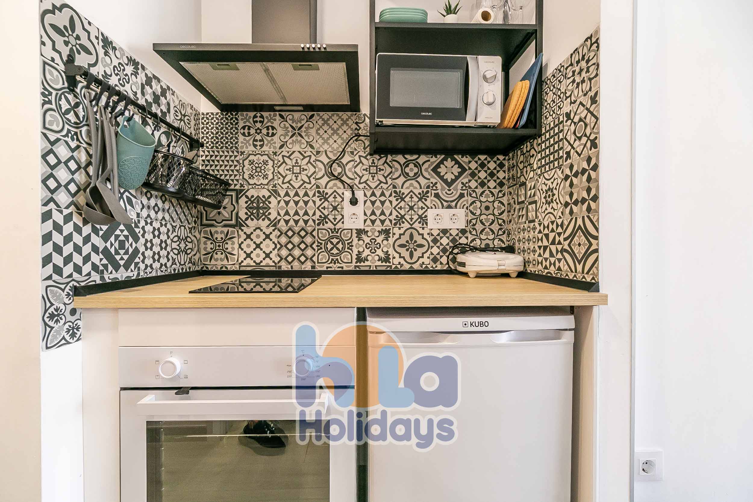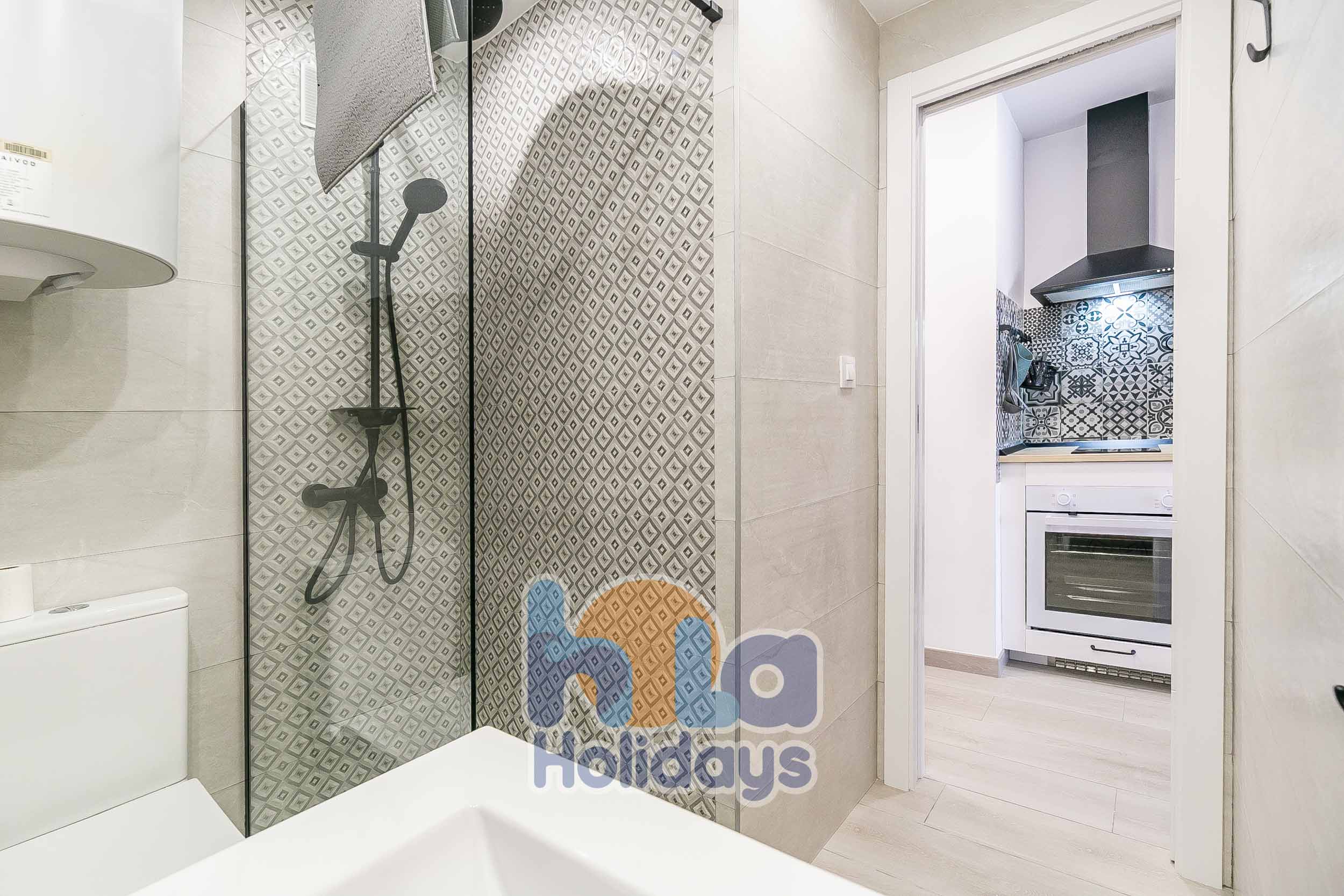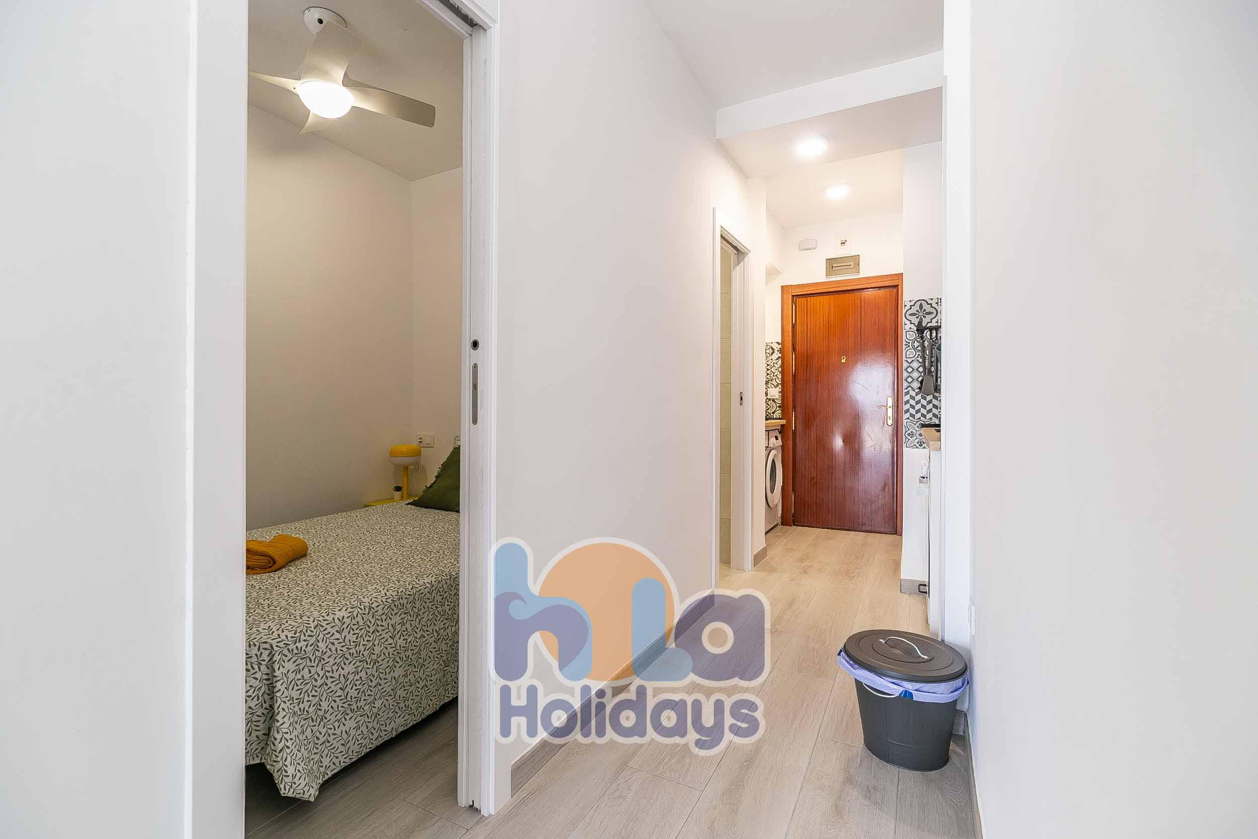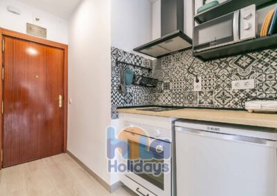 El apartamento se compone de una entrada con la zona de cocina al principio, donde bajo la encimera está la lavadora y fregadero. Le sigue la zona de cocina de electrodomésticos, donde está el horno, vitrocerámica, extractor y frigorífico.