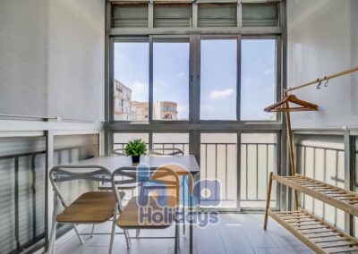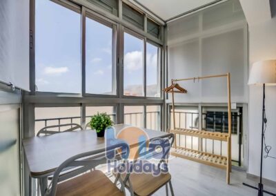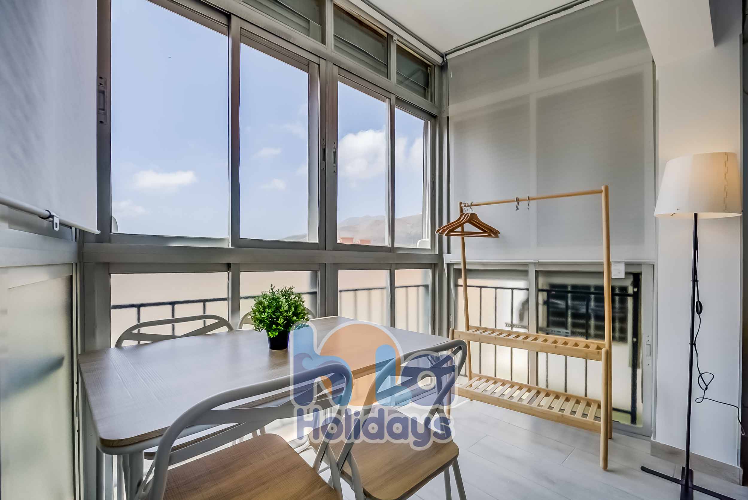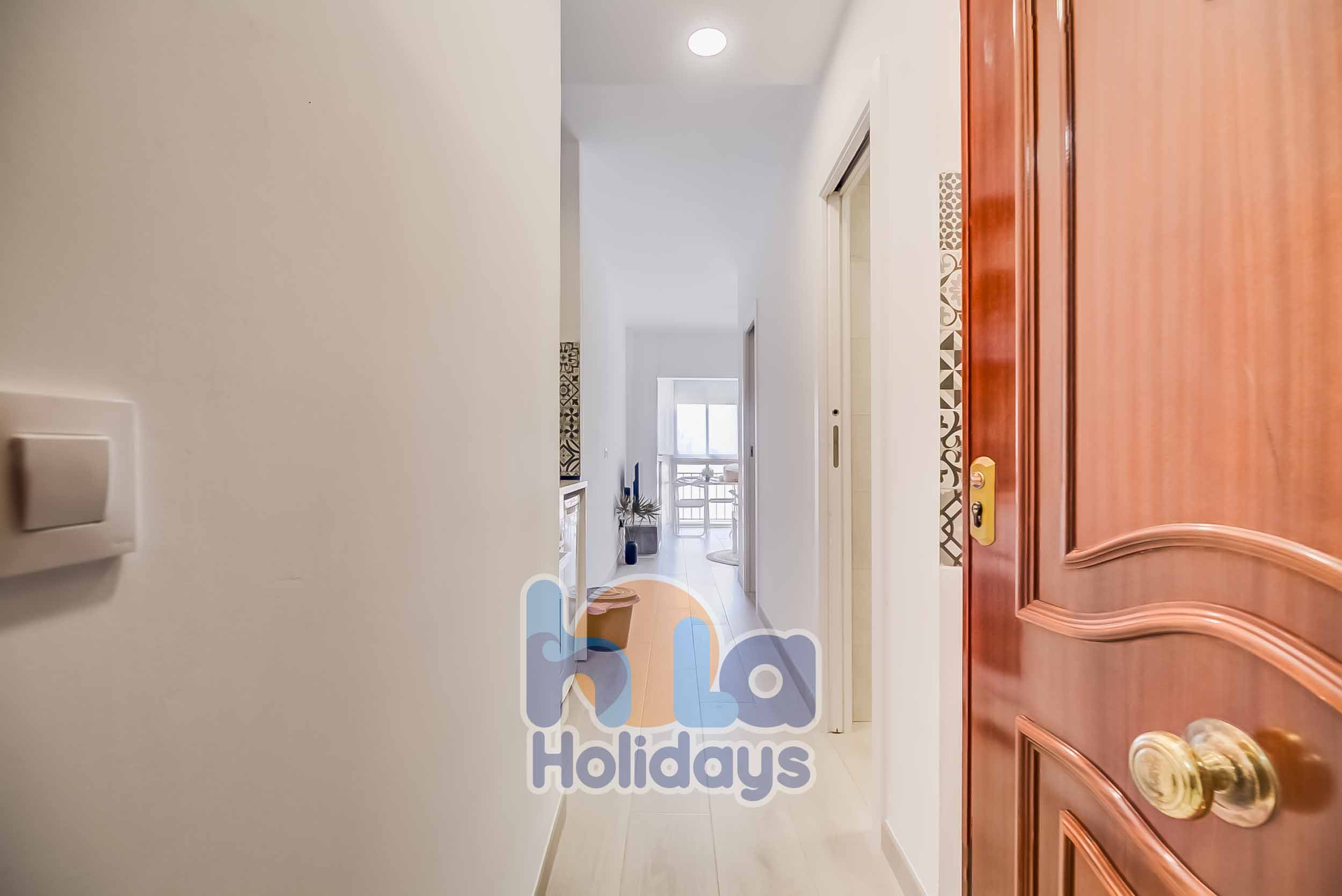 En ese pasillo está la habitación del dormitorio principal con cama de matrimonio y luego está al salón comedor con una ampliación de la terraza , donde está la zona de comedor junto a la gran ventana. En el salón está también el sofá cama muy amplio y la zona de TV y conexión a internet por fibra.