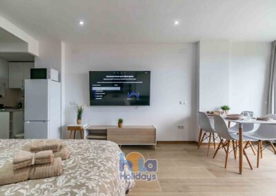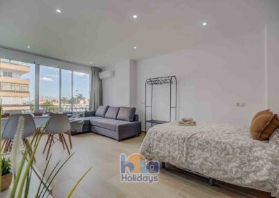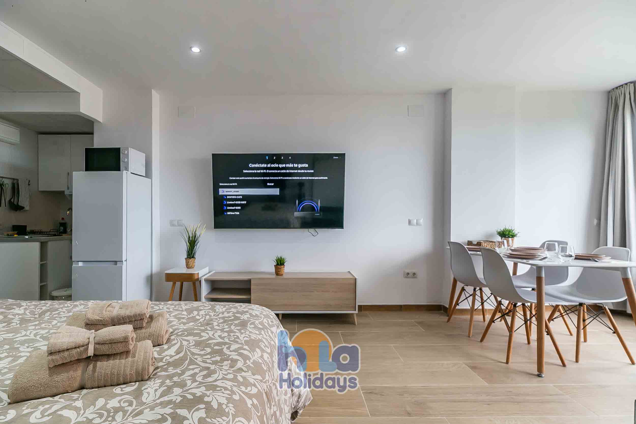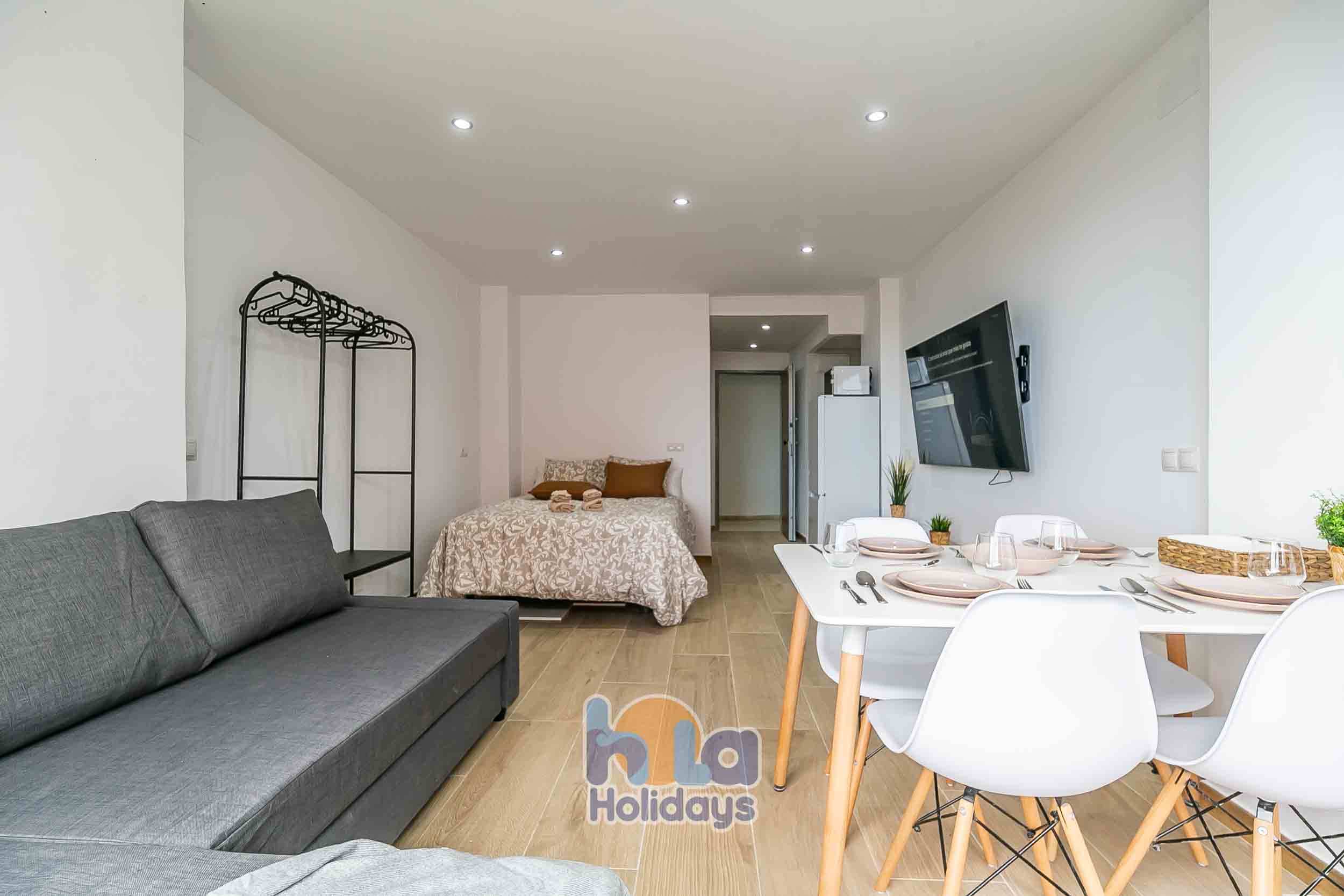 El estudio está recién reformado, con todo a estrenar, es luminoso, accesible, seguro y tranquilo, perfecto para parejas o pequeñas familias o grupos. Cuenta con un salón comedor donde se ubica un sofá cama cheslong, zona con gran TV, mesa de comedor junto a una gran ventana con vistas al jardín, y también hay una cama de matrimonio. La cocina abierta al salón, está totalmente equipada con muebles y electrodomésticos nuevos. El piso tiene baño completo reformado con cómoda ducha. Los huéspedes solo tendrán que preocuparse de disfrutar del buen clima en Torremolinos.